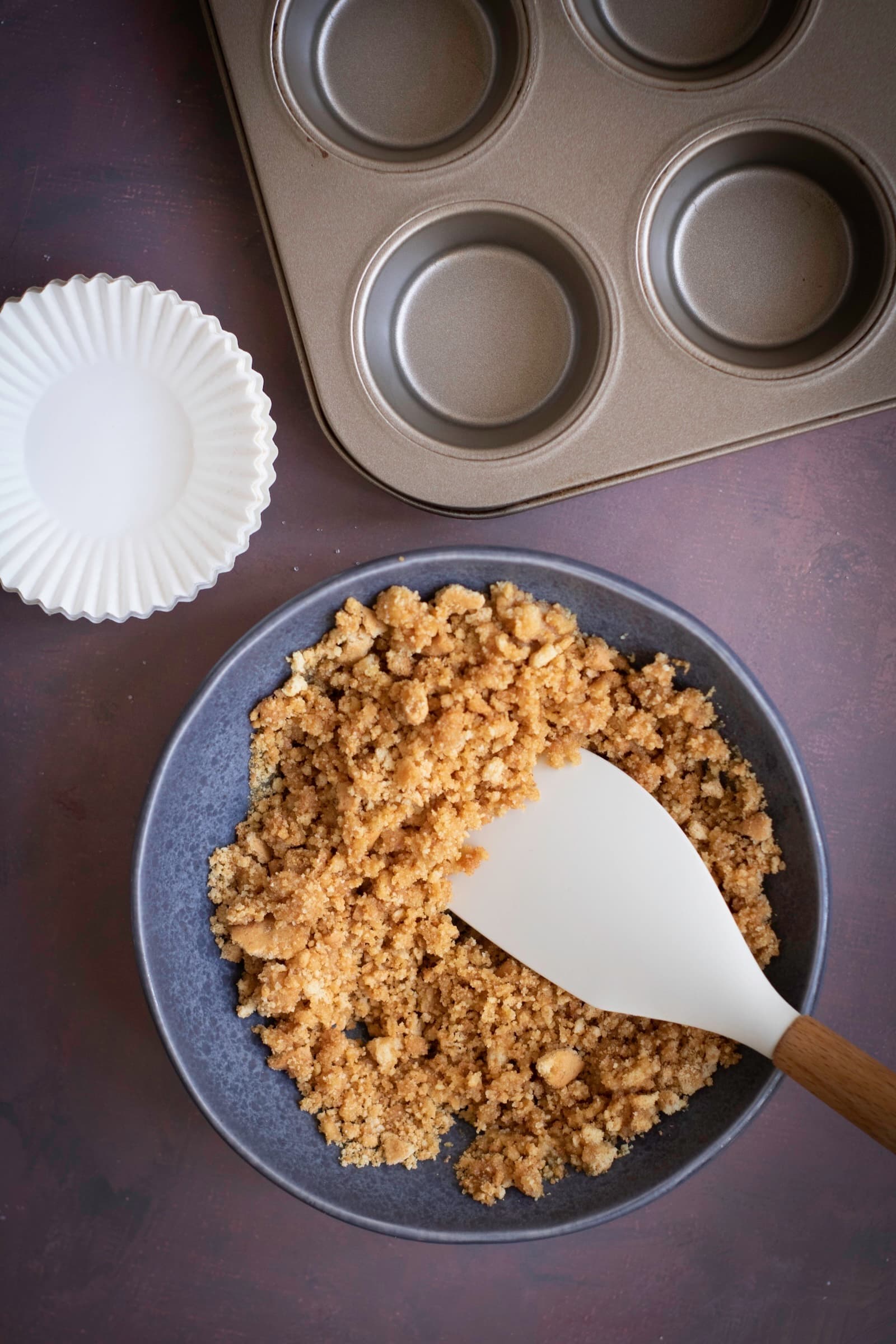 Spoon the crumb mixture into the cupcake liners, dividing it evenly between the 12 cups.