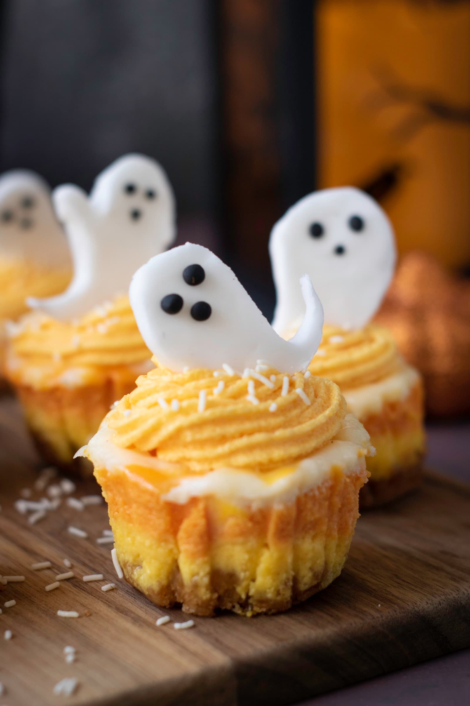 One of my favorite things about mini cheesecakes is how easy they are to serve. Everyone gets their own perfectly portioned dessert, and they look incredibly impressive on a Halloween dessert table. These cheesecakes combine a buttery graham cracker crust, smooth and creamy cheesecake layers, fluffy orange frosting, and adorable fondant ghosts for a dessert that is as fun to make as it is to eat.