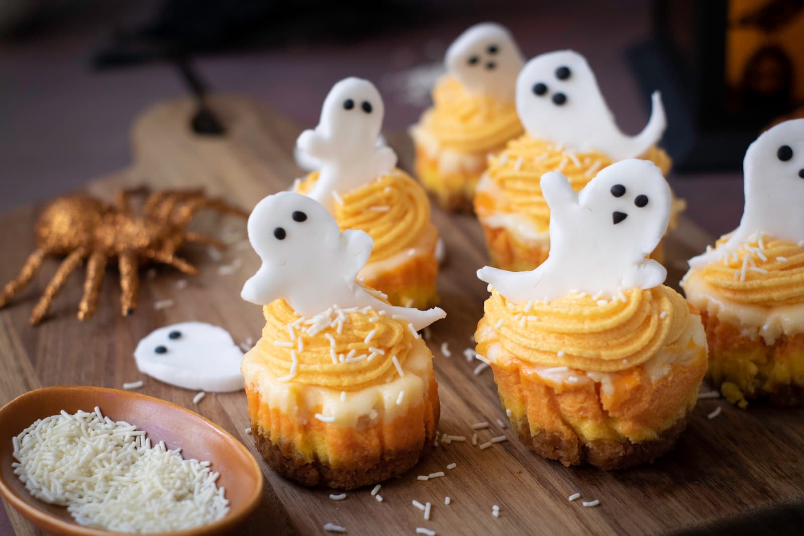 These decorations transform the cheesecakes into adorable Halloween treats.